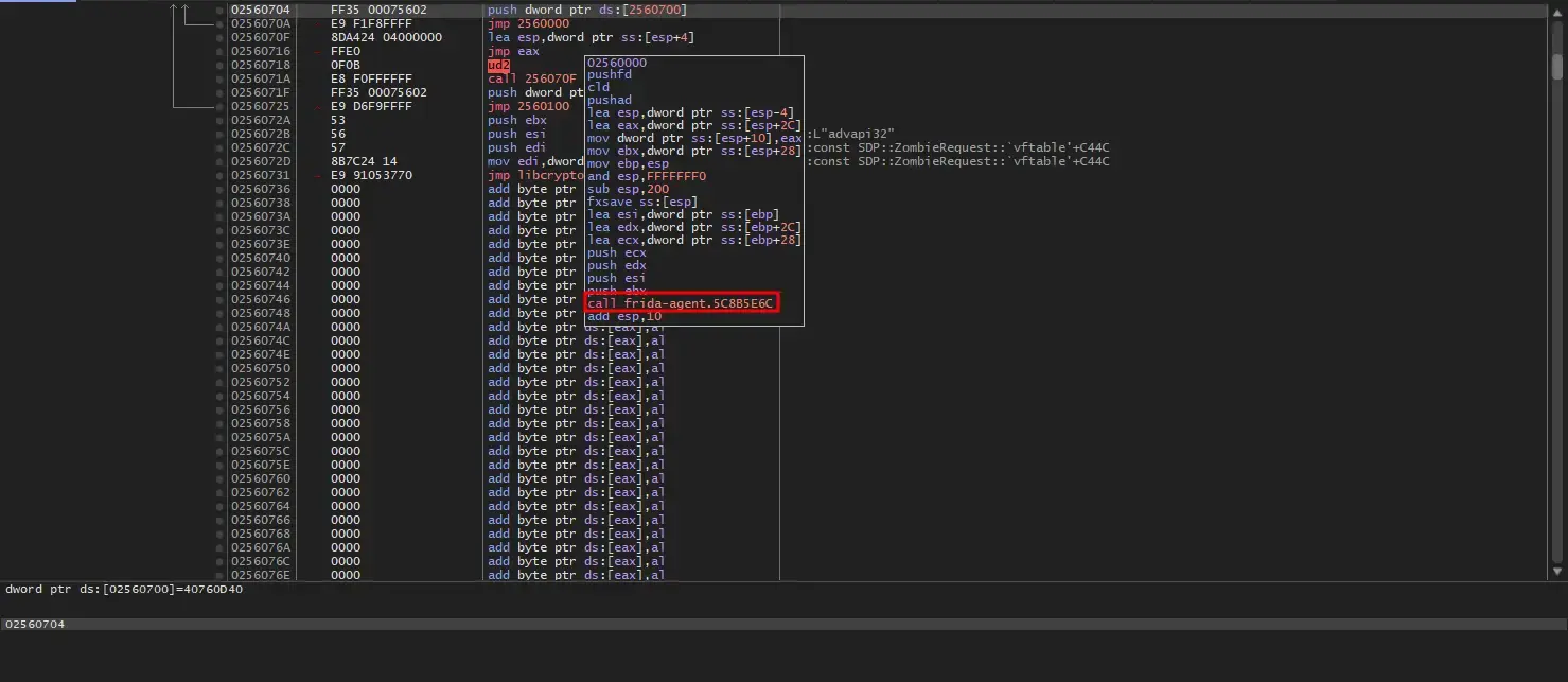 Maybe the addresses in both jmp instructions are Frida-related functions or detours functions: