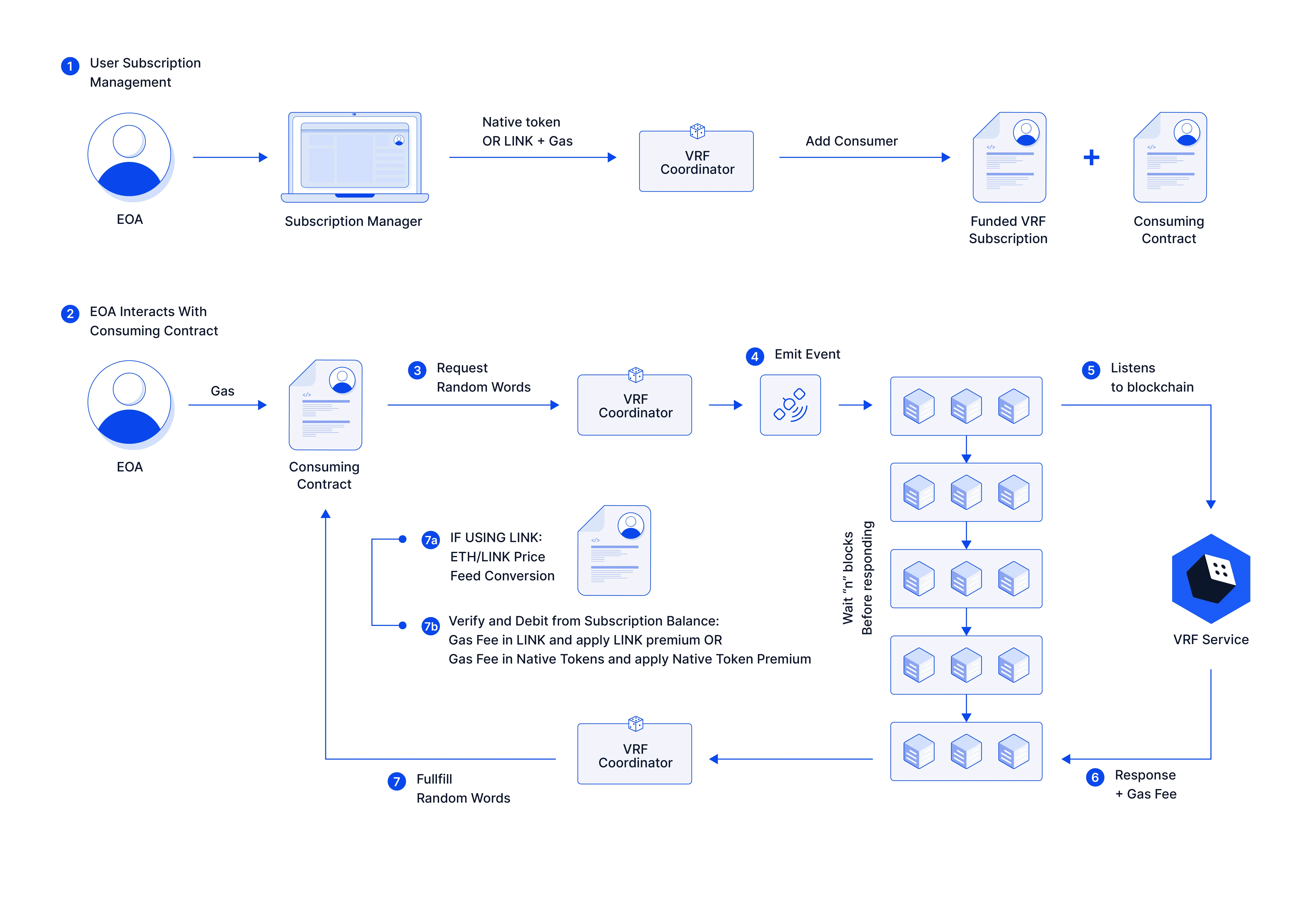 Chainlink VRF hoạt động theo Basic Request Model of Chainlink.
