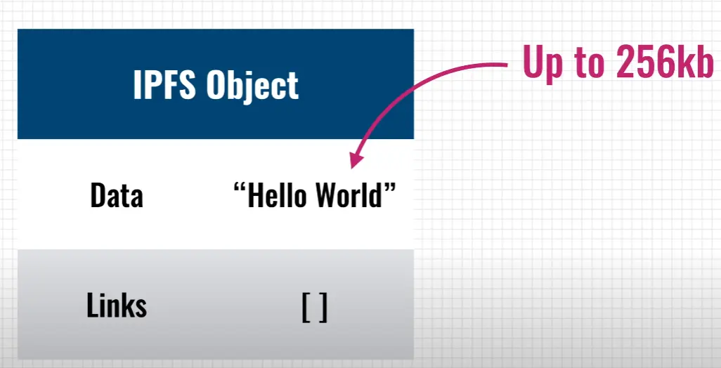 Đối với những dữ liệu lớn, IPFS sẽ chia nhỏ ra làm nhiều object (là block mà tuân theo cấu trúc Merkle DAG). Về bản chất, object là một cấu trúc dữ liệu gồm hai phần: data và links.