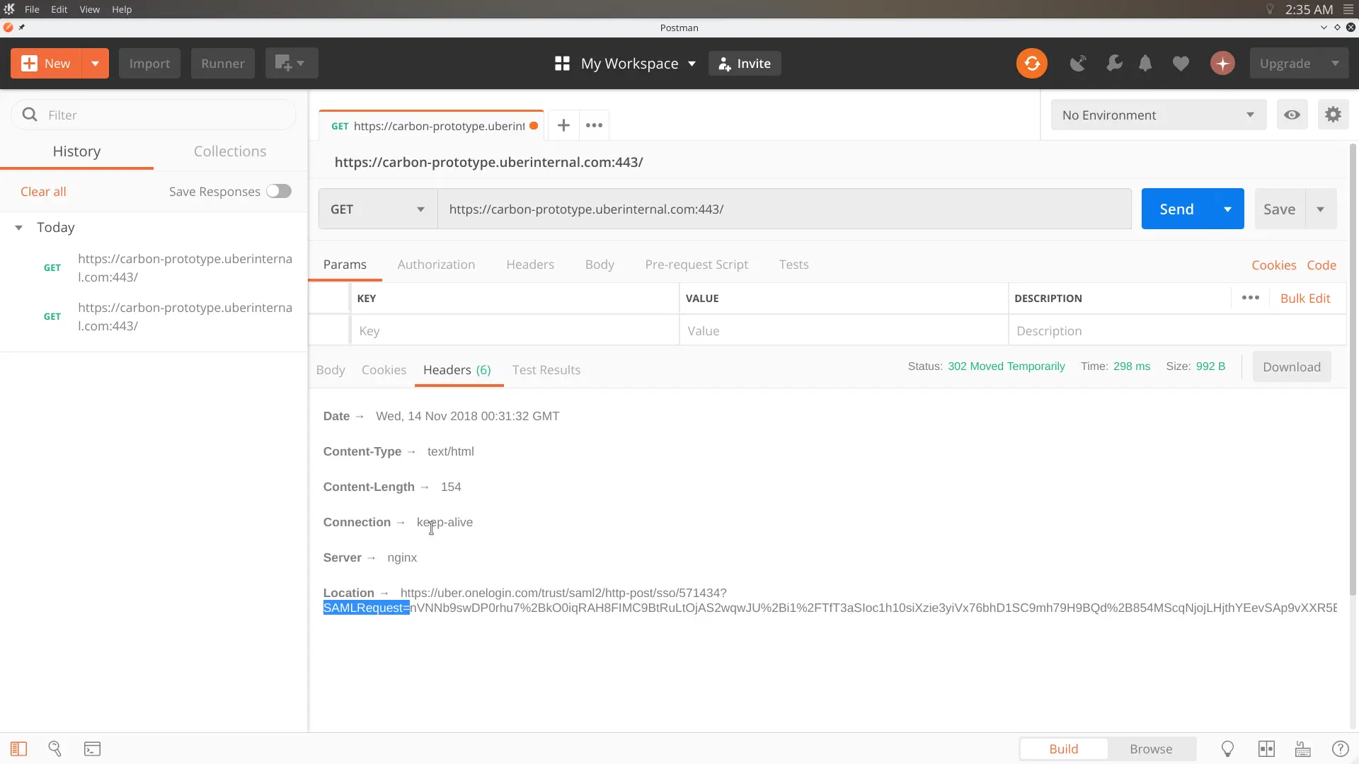 Tác giả nhận thấy rằng đa số các internal domain của Uber đều redirect đến uber.onelogin.com để thực hiện xác thực thông qua cơ chế SAML sử dụng dịch vụ của OneLogin.