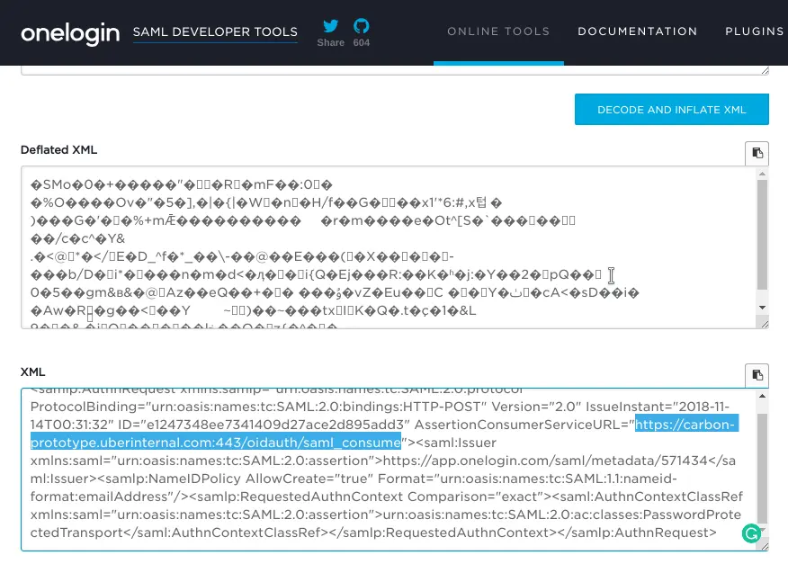 Khi decode thì tìm được ACS URL là https://carbon-prototype.uberinternal.com:443/oidauth/saml_consume: