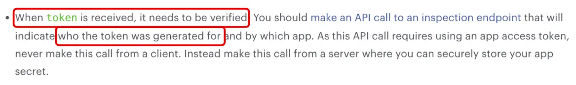 Khi nhận token từ các third-party service chẳng hạn như Facebook, application nên kiểm tra xem token này có hợp lệ hay không bằng cách gọi API để kiểm tra danh tính của chủ sở hữu token.