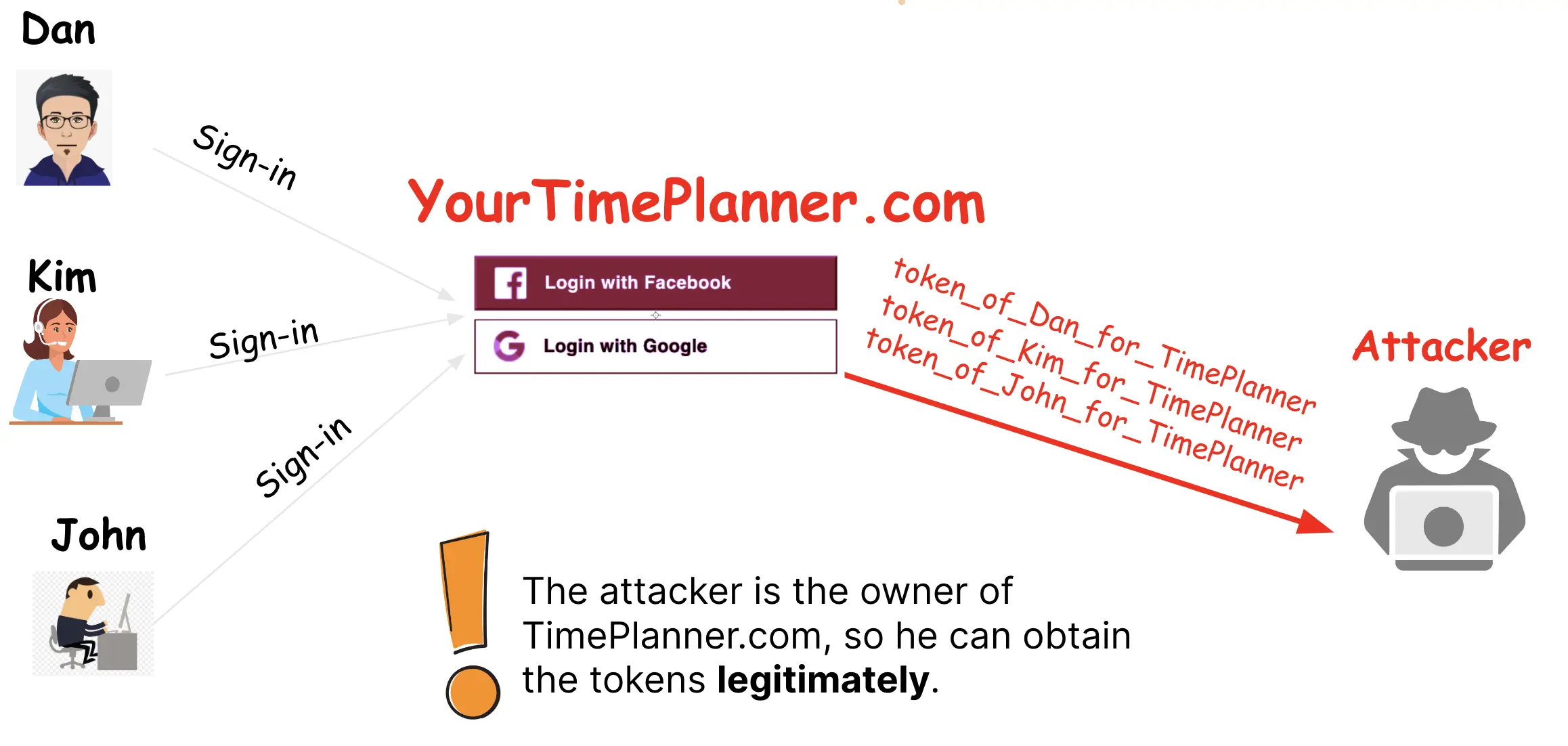 Giả sử attacker tạo ra một malicious website có tên là YourTimePlanner.com và đăng ký nó với Facebook hoặc Google.
