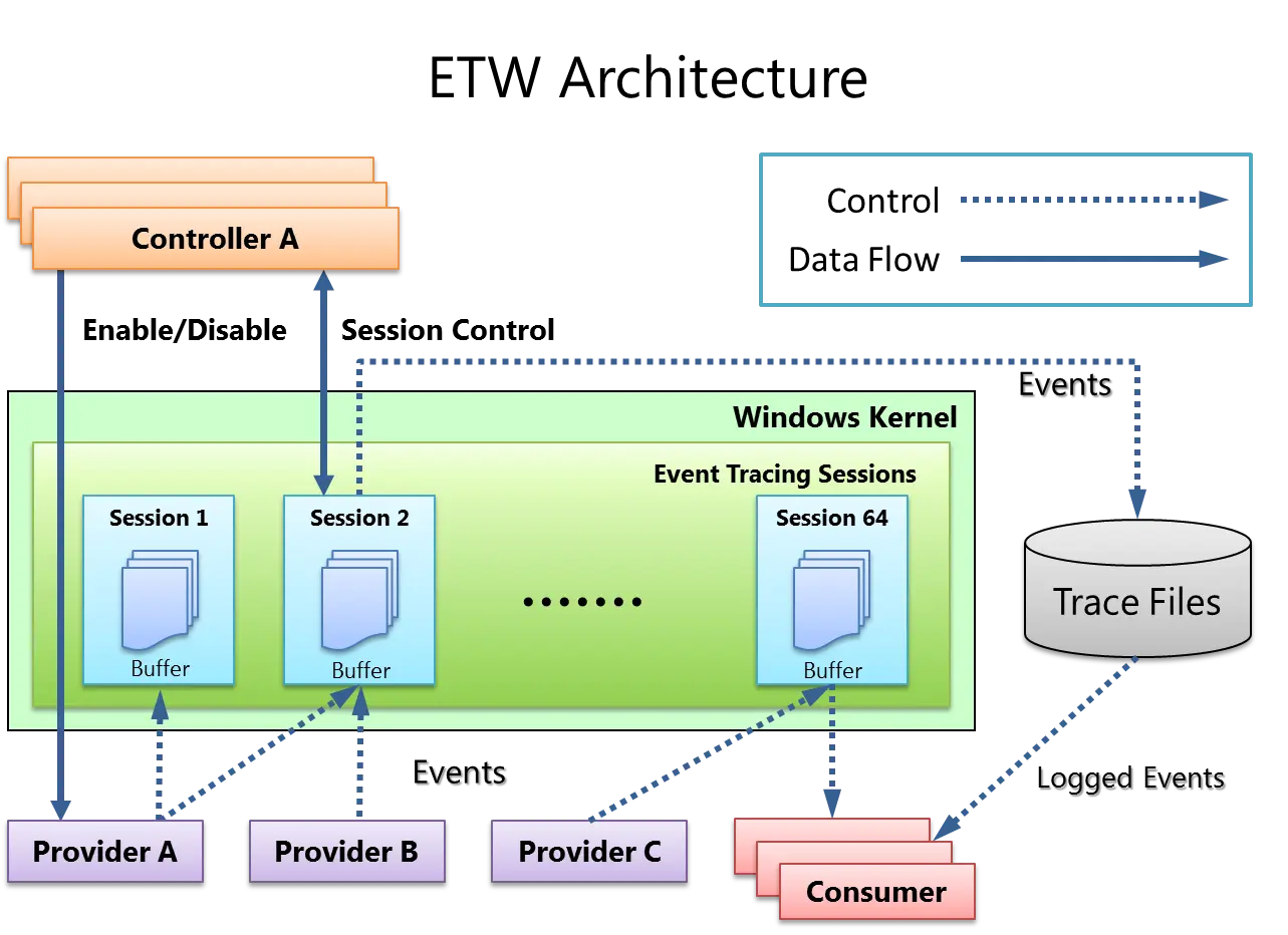 - Provider: thành phần tạo events - có thể của từ user mode app, kernel driver hoặc bản thân kernel của Windows. Để gửi events, nó sẽ cần phải sử dụng logging APIs của ETW.