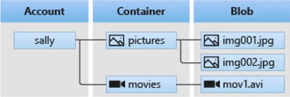 Mỗi Azure Storage Bucket sẽ bao gồm nhiều account names, mỗi account names sẽ có nhiều containers và mỗi container sẽ chứa nhiều file, hay còn gọi là blob.