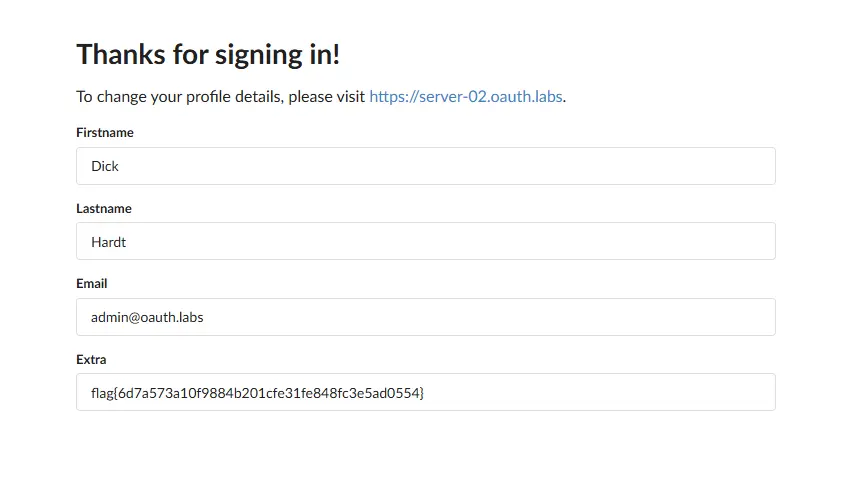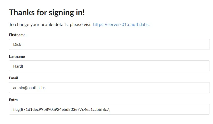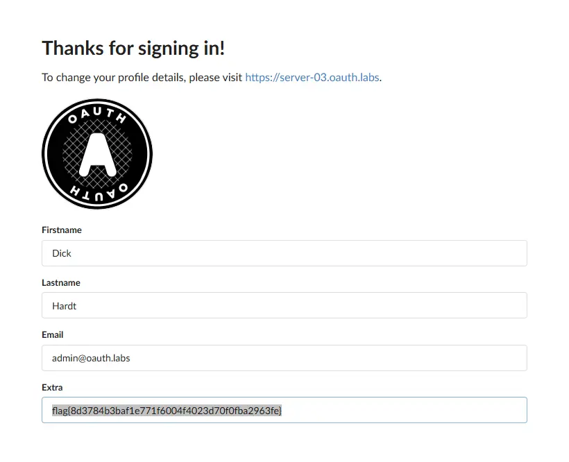 Để tấn công, ta chỉ cần thay đổi profile trong email của chúng ta thành admin@oauth.labs rồi đăng nhập ở phía client application là sẽ có được flag.